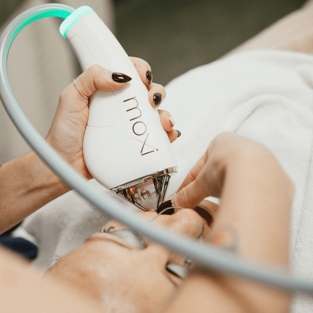 We begin with BBL, using targeted light pulses to treat vascular and pigment issues. After cleansing and prepping the skin, Moxi is then applied across the face using calibrated passes for even resurfacing. We finish with soothing serums and post-care recovery products.